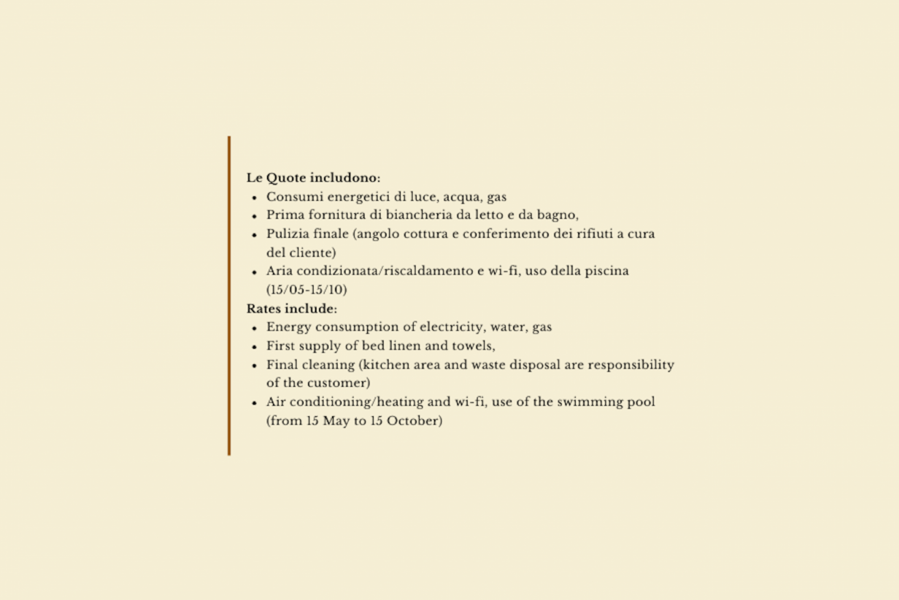 - consumi energetici di luce, acqua, gas, prima fornitura di biancheria da letto e da bagno, pulizia finale ( eccetto la pulizia dell' angolo cottura e conferimento dei rifiuti a cura del cliente o supplemento di € 50), aria condizionata/ riscaldamento, uso della piscina (aperta dal 15/05 - 15/10) e utilizzo del wi-fi.