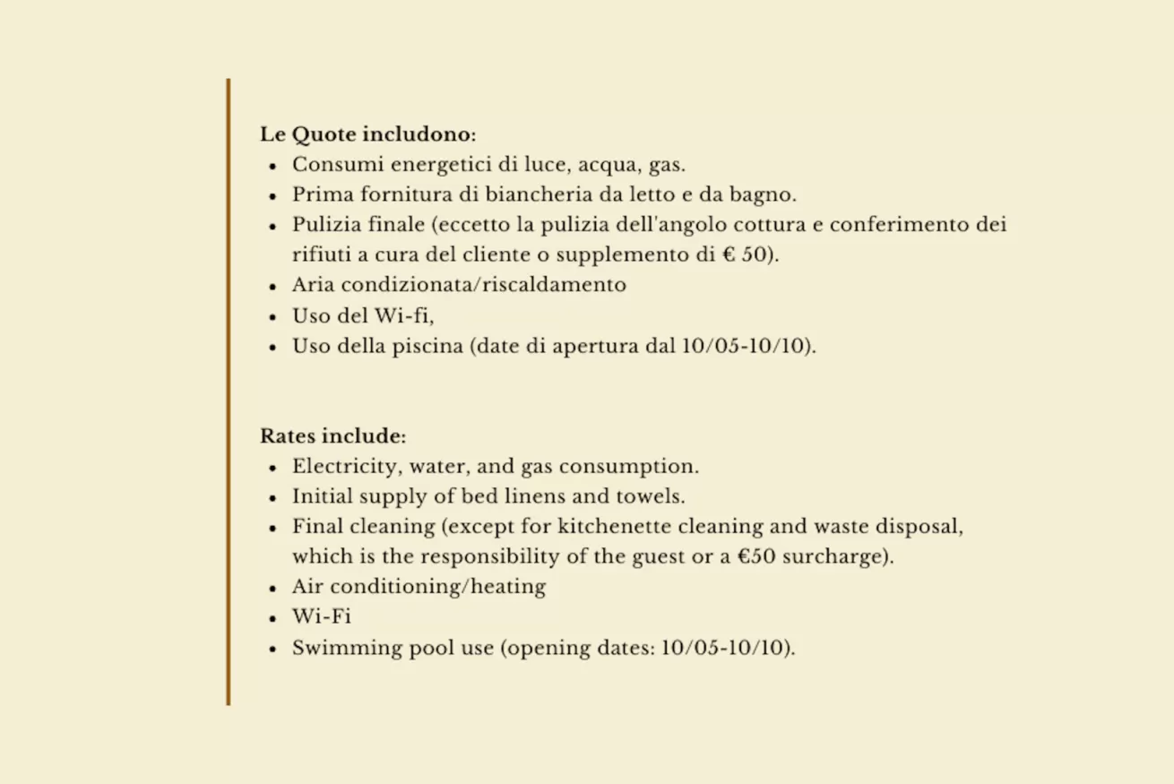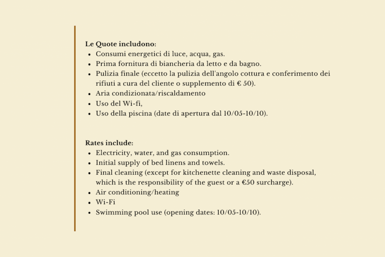 - consumi energetici di luce, acqua, gas, prima fornitura di biancheria da letto e da bagno, pulizia finale ( eccetto la pulizia dell' angolo cottura e conferimento dei rifiuti a cura del cliente o supplemento di € 50), aria condizionata/ riscaldamento, uso della piscina (aperta dal 10/05 - 10/10) e utilizzo del wi-fi.