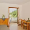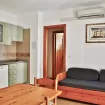 Bilocale di circa 29 mq composto da soggiorno, angolo cottura con frigorifero, forno a microonde e piastre elettriche, divano letto doppio e balcone attrezzato con tavolo e sedie.