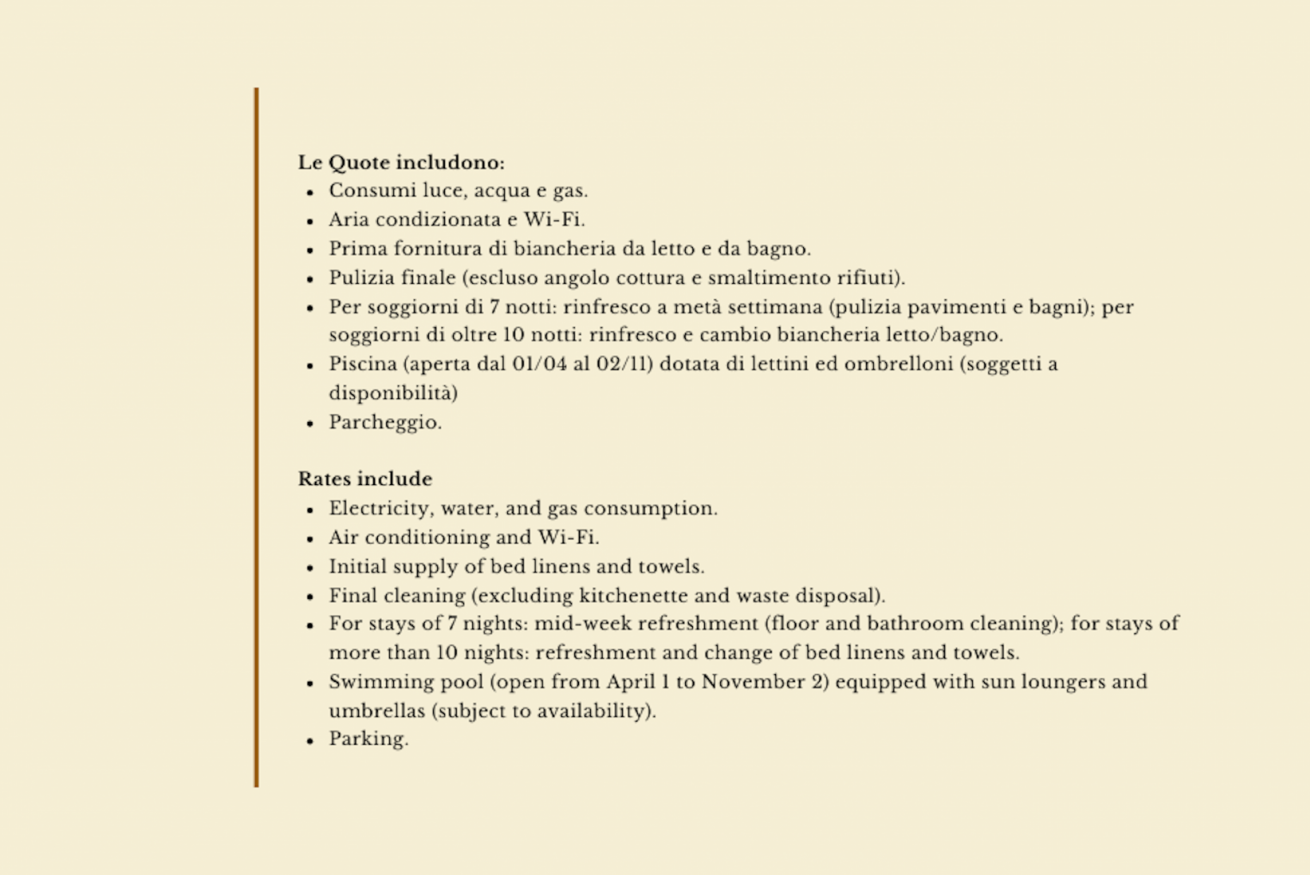 - consumi luce, acqua e gas, aria condizionata, prima fornitura di biancheria da letto e da bagno, parcheggio; pulizia finale (escluso angolo cottura e smaltimento rifiuti).