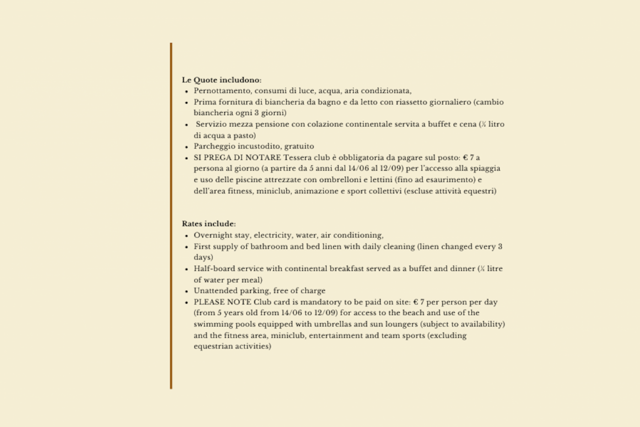 - tessera club: € 7 a persona al giorno (obbligatoria a partire da 5 anni dal 14/06 al 12/09) per l’accesso alla spiaggia, uso delle piscine e dell’area fitness, miniclub, animazione e sport collettivi (escluse attività equestri)
