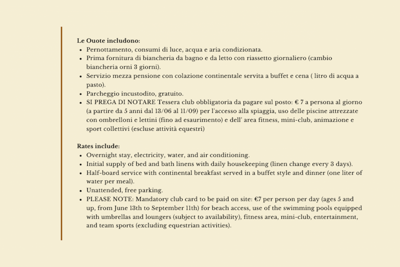 - tessera club: € 7 a persona al giorno (obbligatoria a partire da 5 anni dal 13/06 al 11/09) per l’accesso alla spiaggia, uso delle piscine e dell’area fitness, miniclub, animazione e sport collettivi (escluse attività equestri)