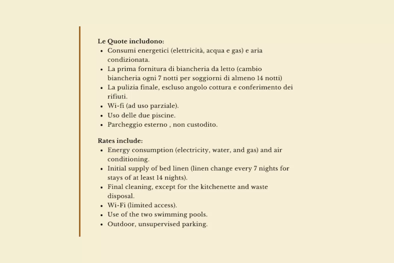 - prima fornitura di biancheria da letto (cambio ogni 7 giorni per soggiorni minimo 14 notti)