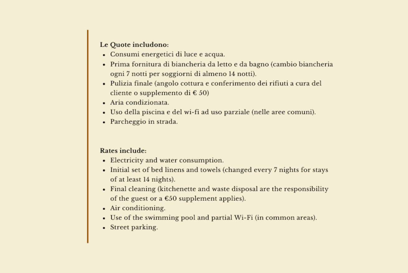 - pulizia finale (angolo cottura e conferimento dei rifiuti a cura del cliente o supplemento di € 50)