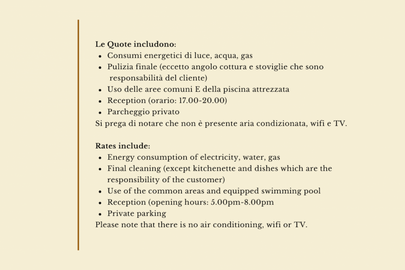 - consumi di luce, acqua, gas, pulizia finale, parcheggio, uso della piscina e delle aree comuni.