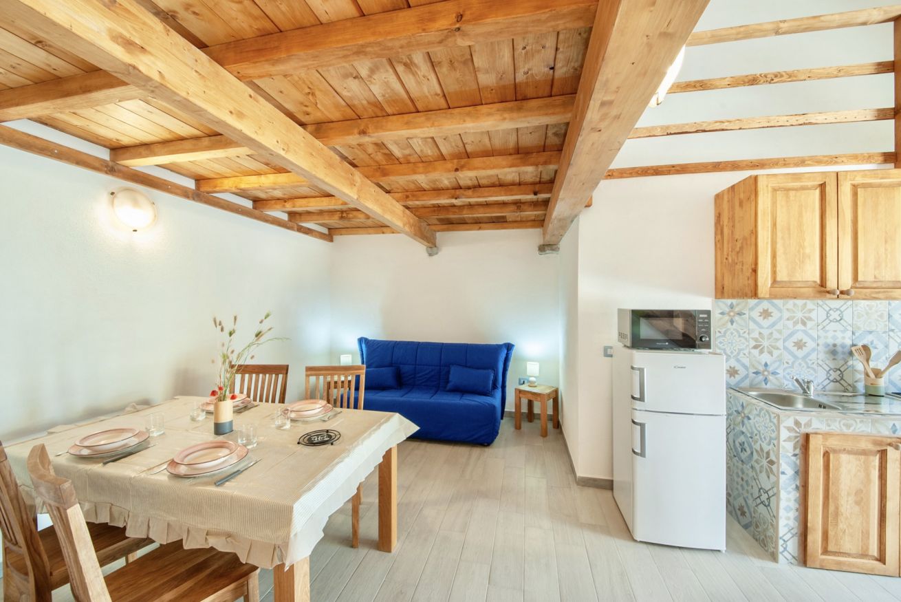 The large open space lofts, measuring around 40 m2, are furnished in typical Sardinian style simply and functionally; consisting of a welcoming living room with a double sofa bed and equipped kitchenette and a mezzanine area where the double bed is located.