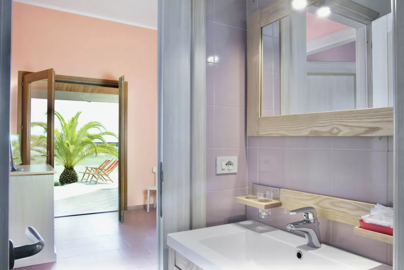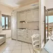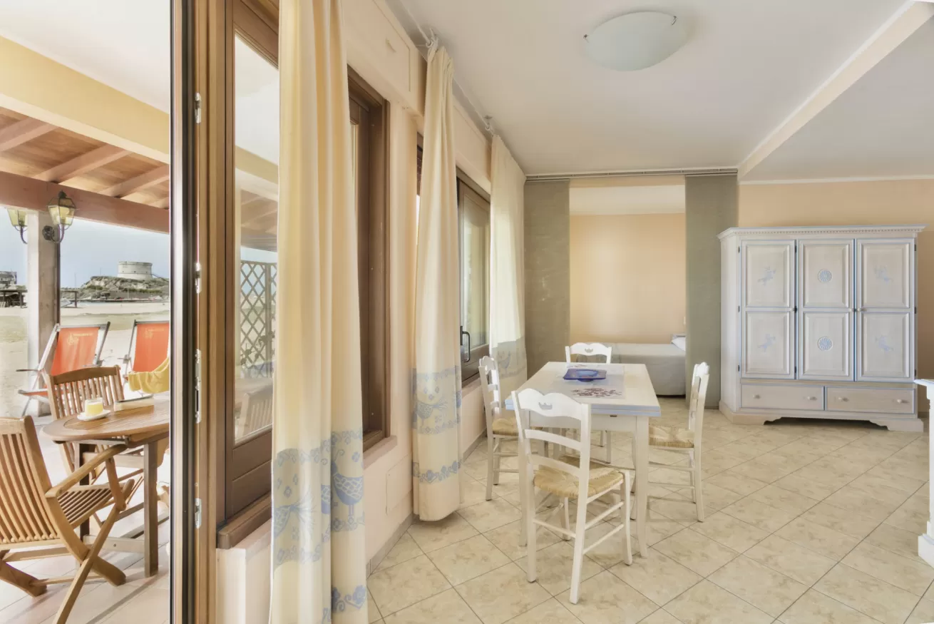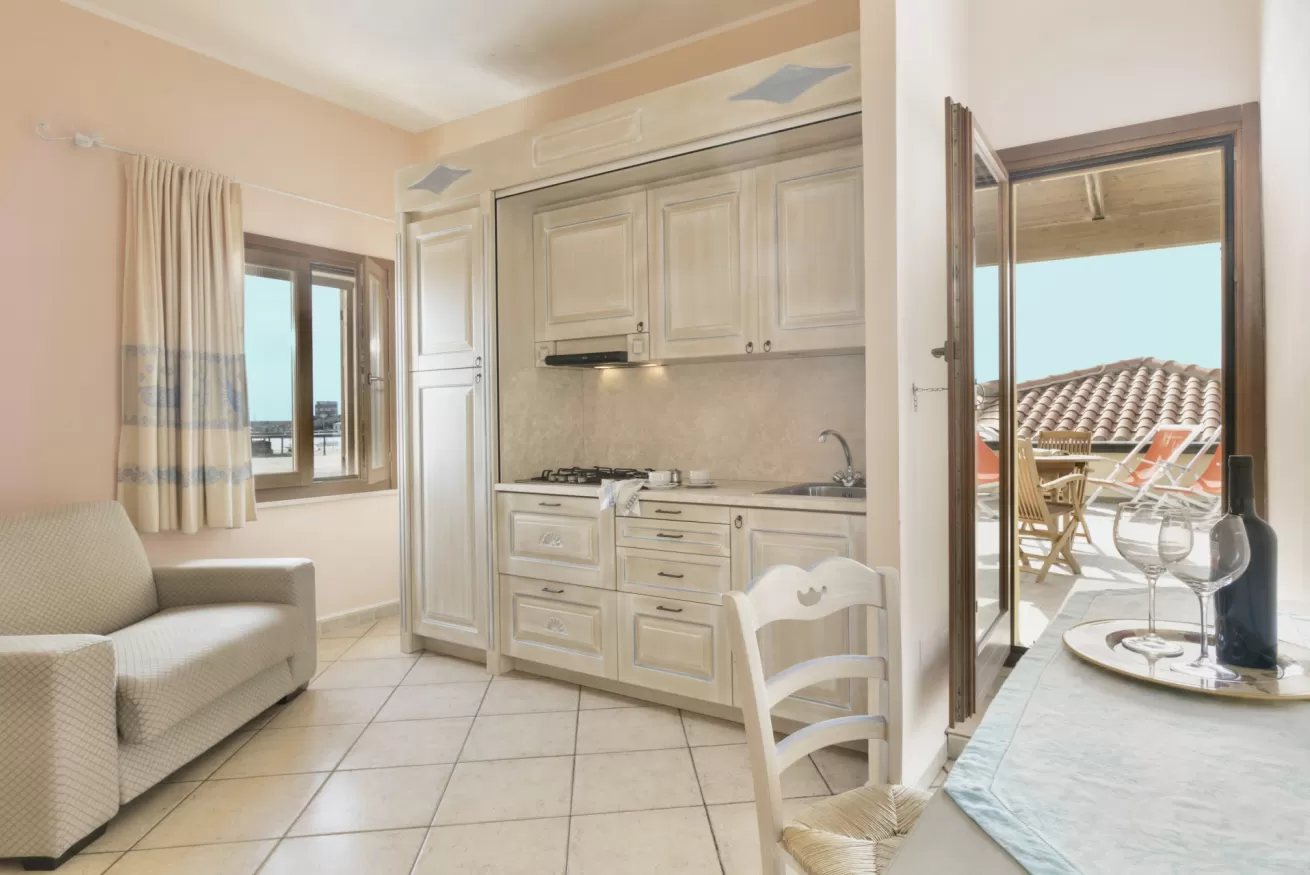Spazioso monolocale con vista mare di circa 40 mq posto al piano terreno dotato di aria condizionata e linea wi fi composto da lato cottura attrezzato con frigorifero, televisore a schermo piatto, tavolo e sedie.