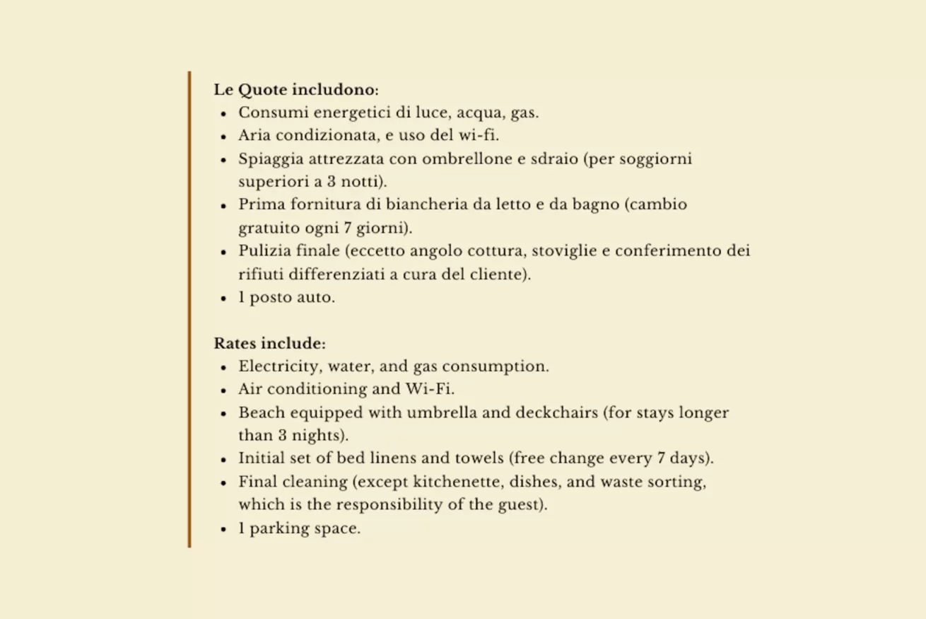 - consumi di luce, acqua, gas, aria condizionata, prima fornitura di biancheria da letto e da bagno (cambio gratuito ogni 7 giorni), uso del wi-fi, uso della spiaggia privata - 1 ombrellone e due lettini (per soggiorni superiori a 3 notti), posto auto e pulizia finale (esclusa pulizia angolo cottura, a cura del cliente). Culla su richiesta gratuita.
