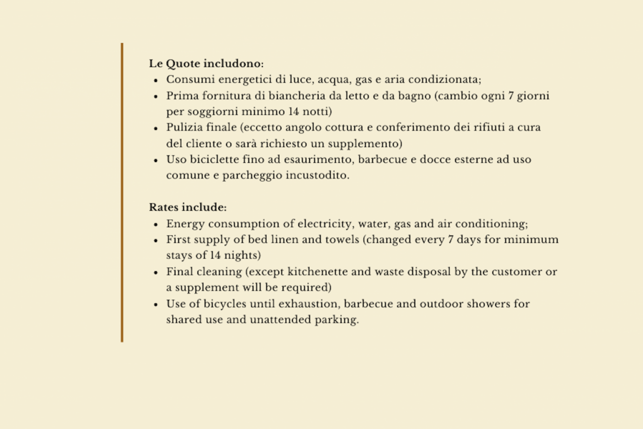 - tourist tax: mandatory according to municipal provisions; to be paid in cash, the amount may vary depending on the period
