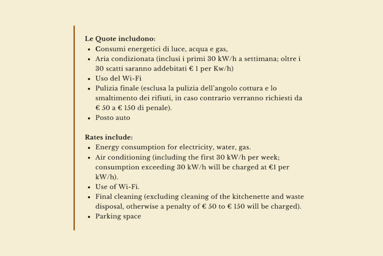 - consumi energetici di luce, acqua e gas, aria condizionata (inclusi i primi 30 kW/h a settimana; oltre i 30 scatti saranno addebitati € 1 per Kw/h), uso del wi-fi e pulizia finale (esclusa la pulizia dell’angolo cottura e lo smaltimento dei rifiuti, in caso contrario verranno richiesti da € 50 a € 150 di penale); posto auto