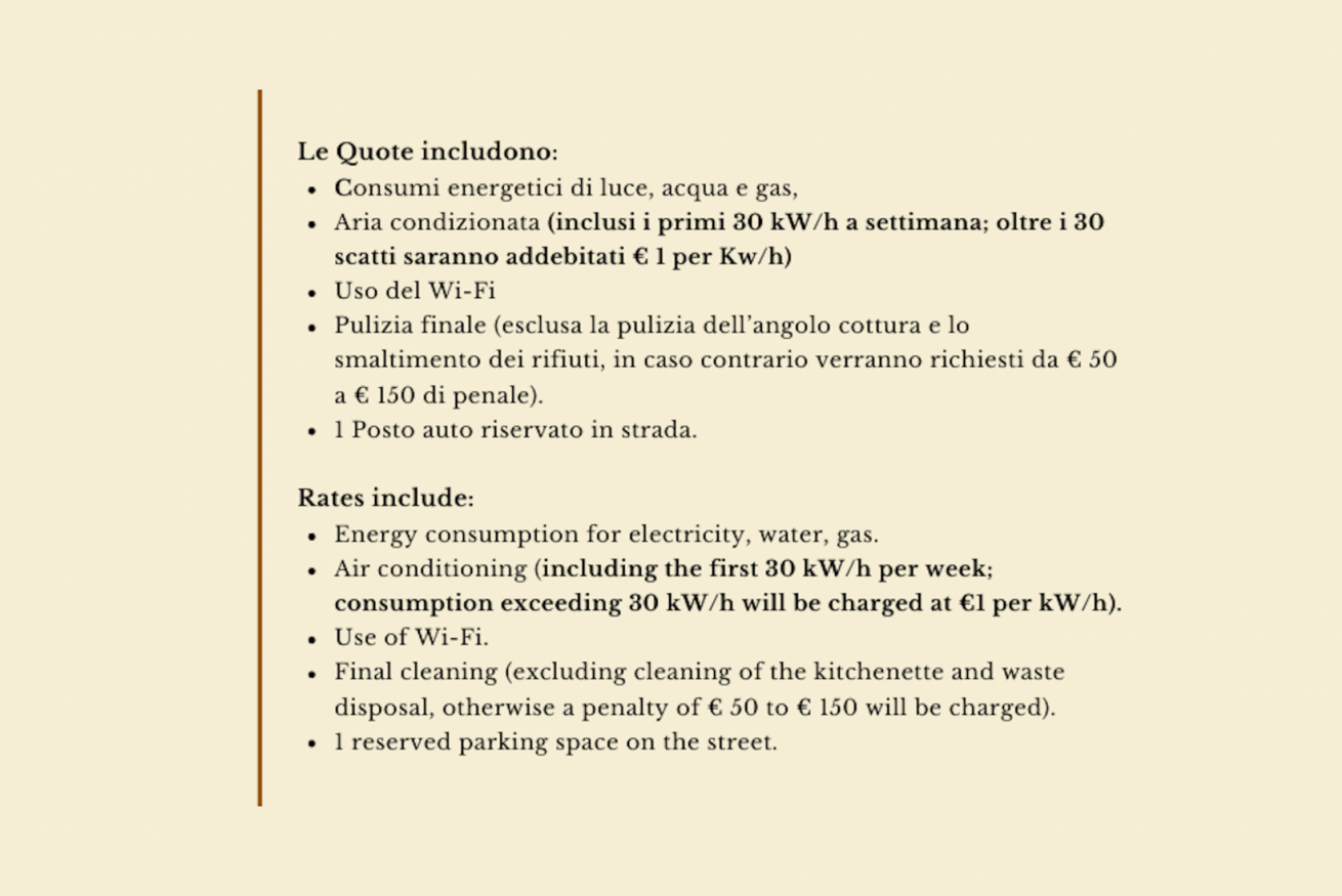 - consumi energetici di luce, acqua e gas, aria condizionata (inclusi i primi 30 kW/h a settimana; oltre i 30 scatti saranno addebitati € 1 per Kw/h), uso del wi-fi e pulizia finale (esclusa la pulizia dell’angolo cottura e lo smaltimento dei rifiuti, in caso contrario verranno richiesti da € 50 a € 150 di penale); 1 posto auto riservato in strada