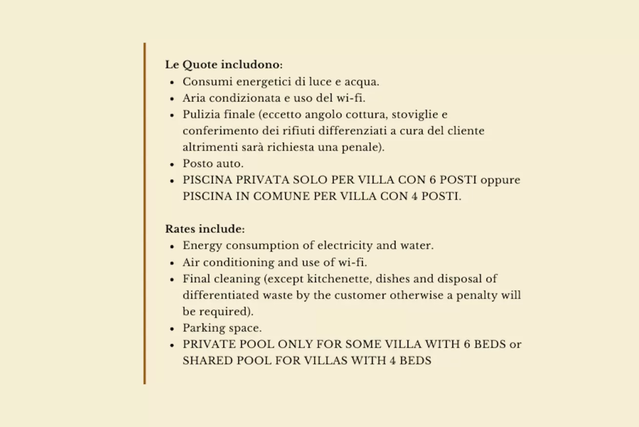- consumi di luce, acqua, gas, aria condizionata, uso del wi-fi e pulizia finale (esclusa pulizia angolo cottura, a cura del cliente in caso contrario verranno richiesti € 25)