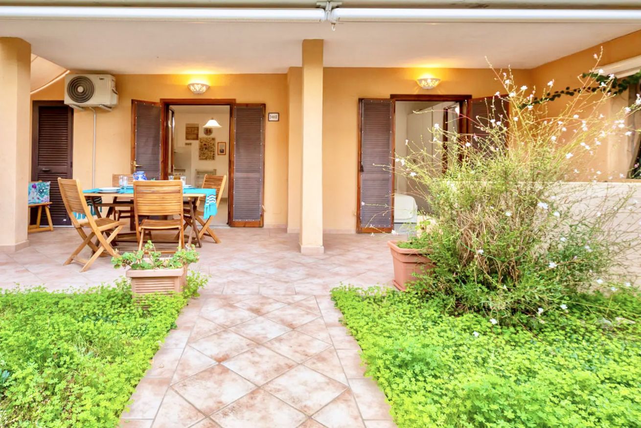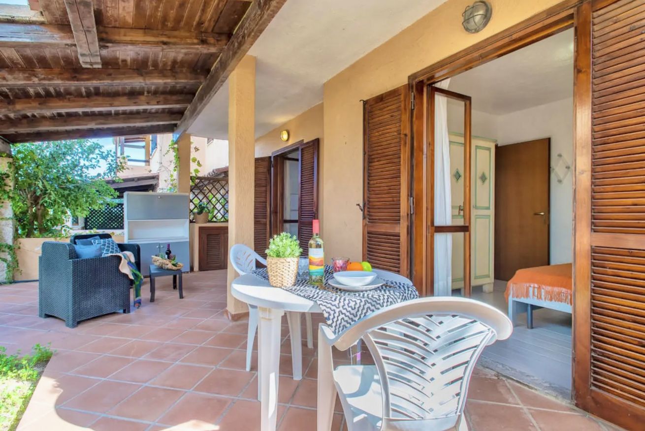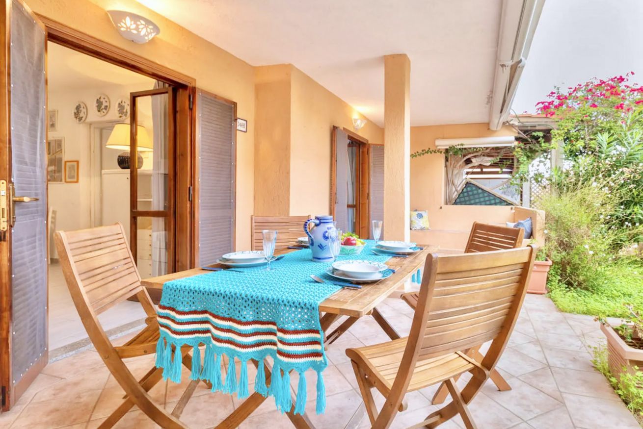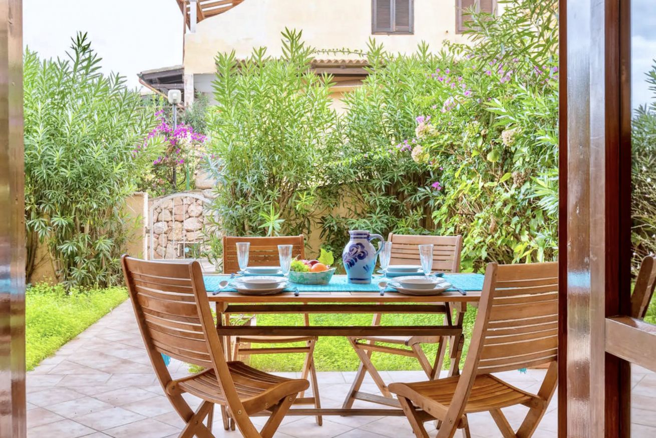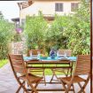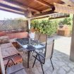 L’appartamento si trova al piano terra con patio esterno, arredato con tavolo e sedie e giardino recintato.
