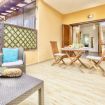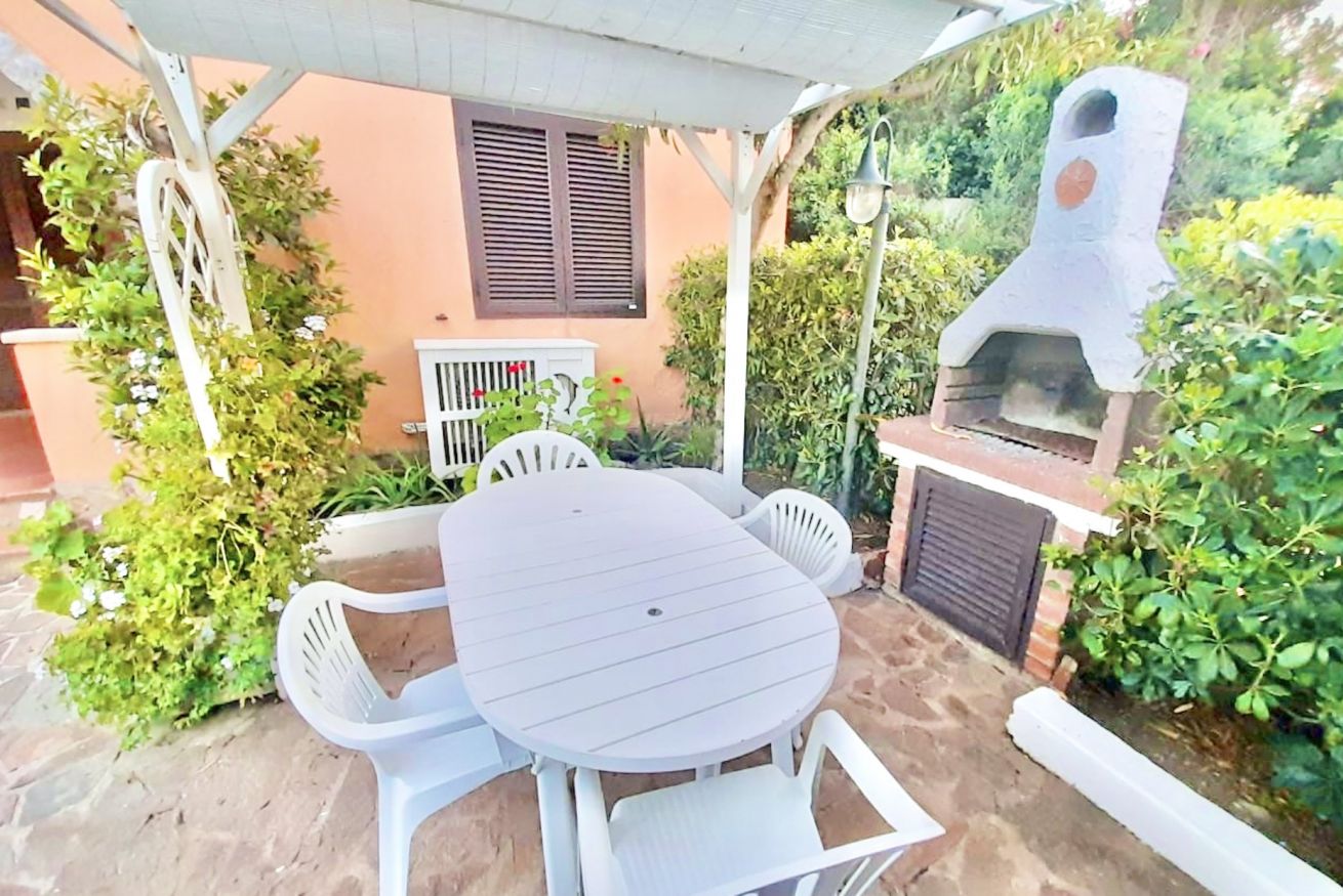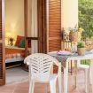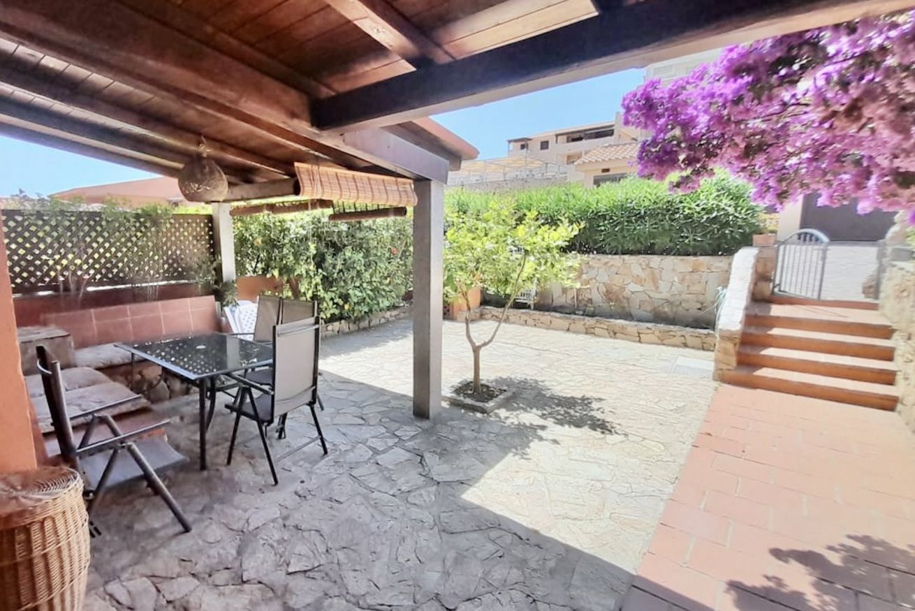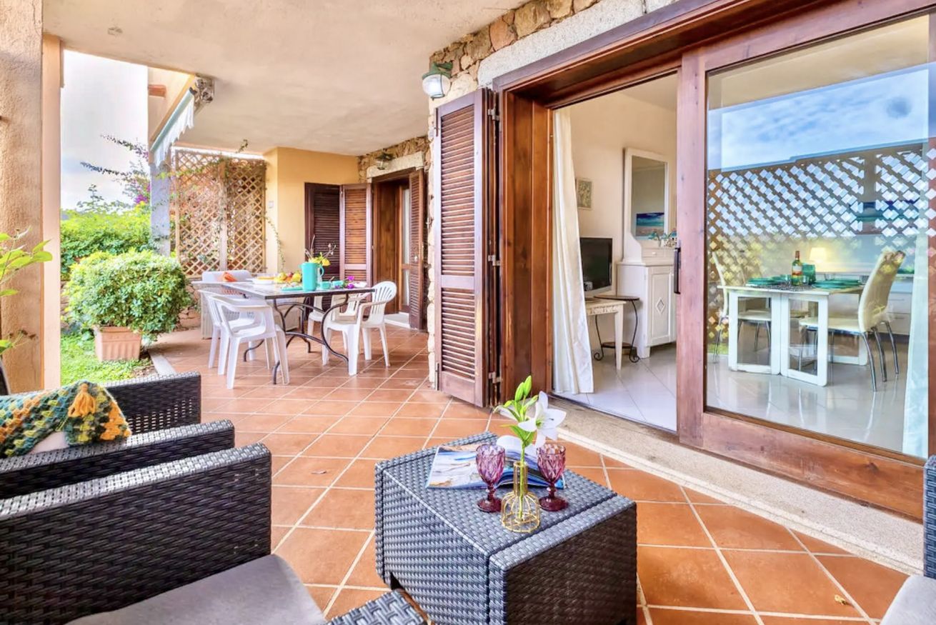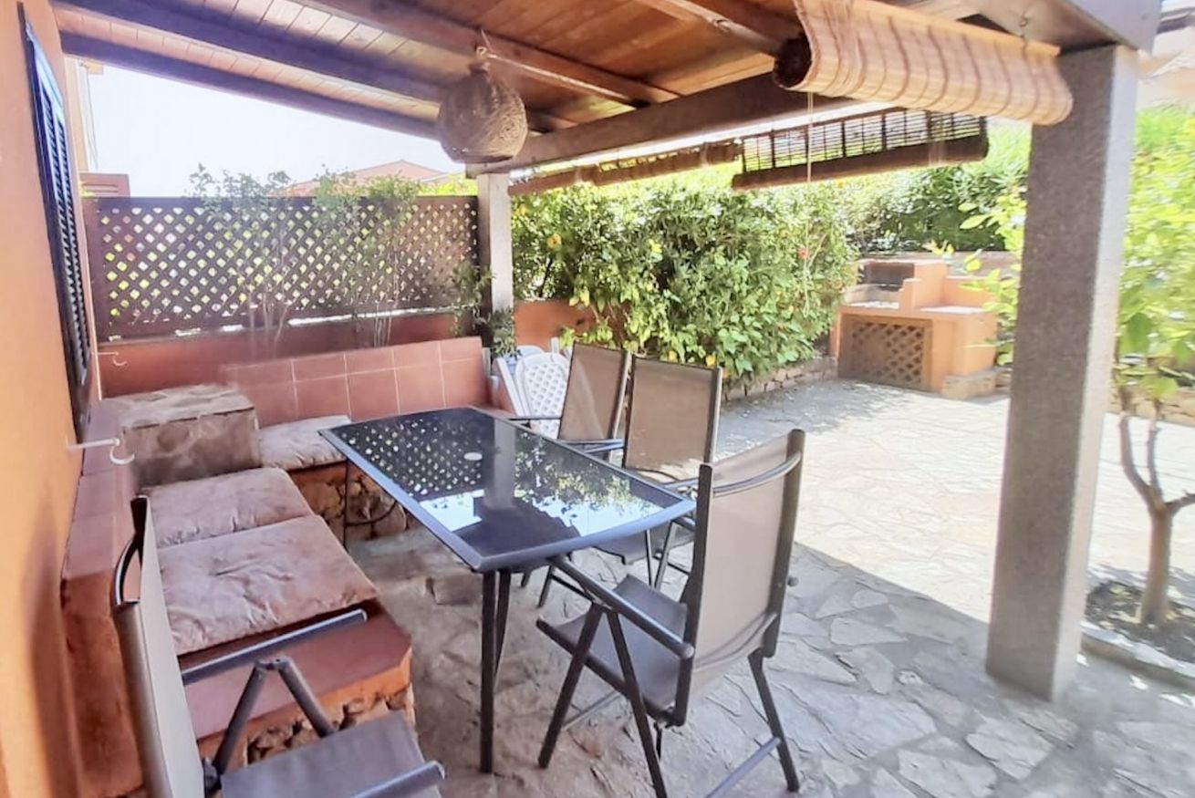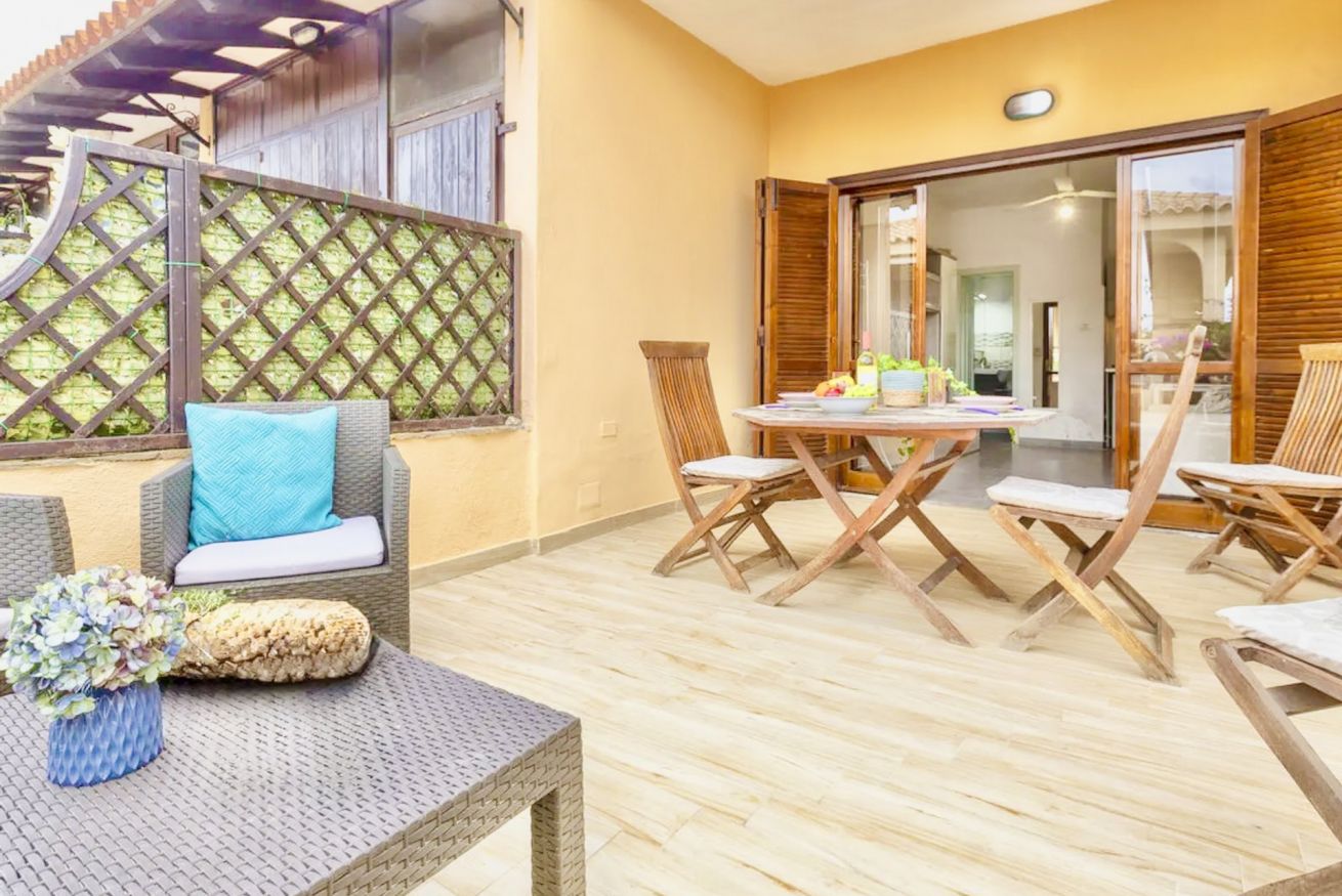 L’appartamento si trova al piano terra con patio esterno, arredato con tavolo e sedie e giardino recintato.