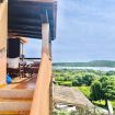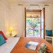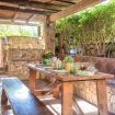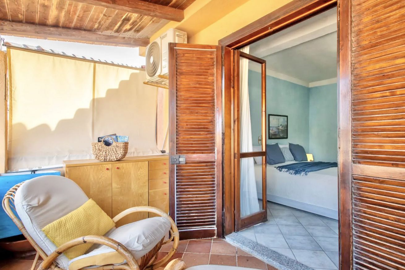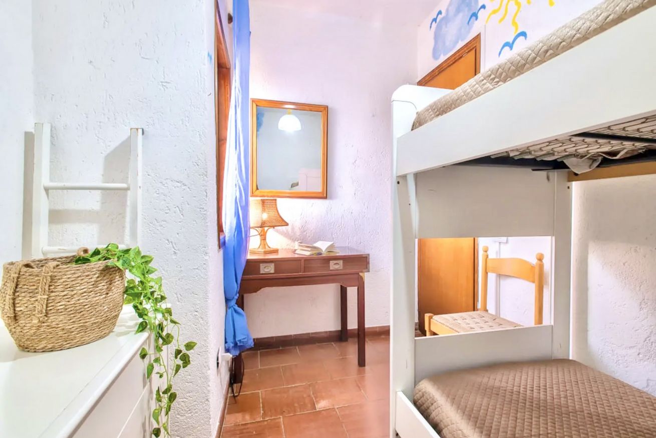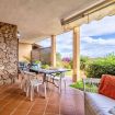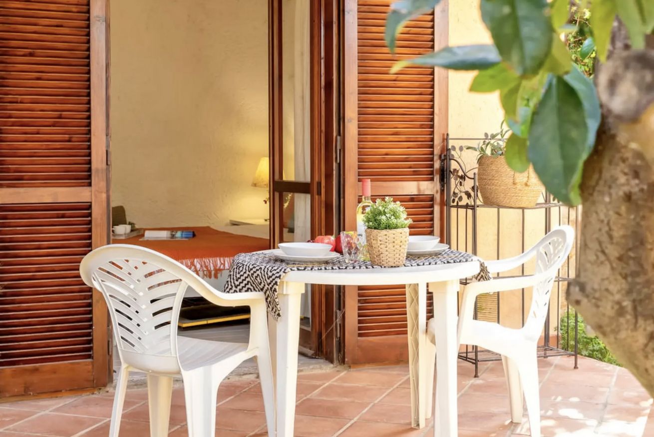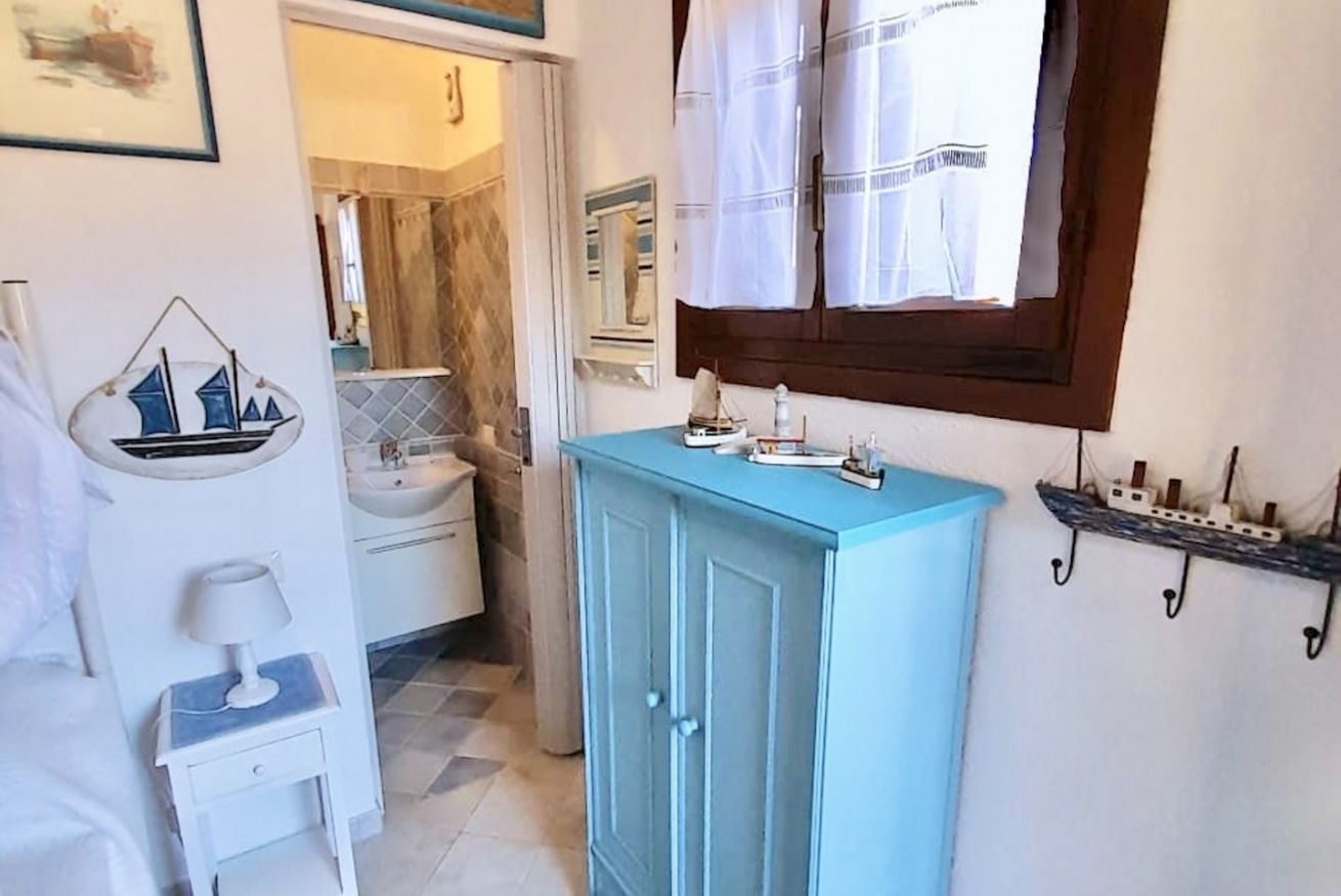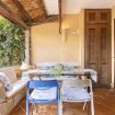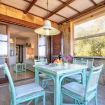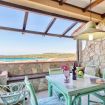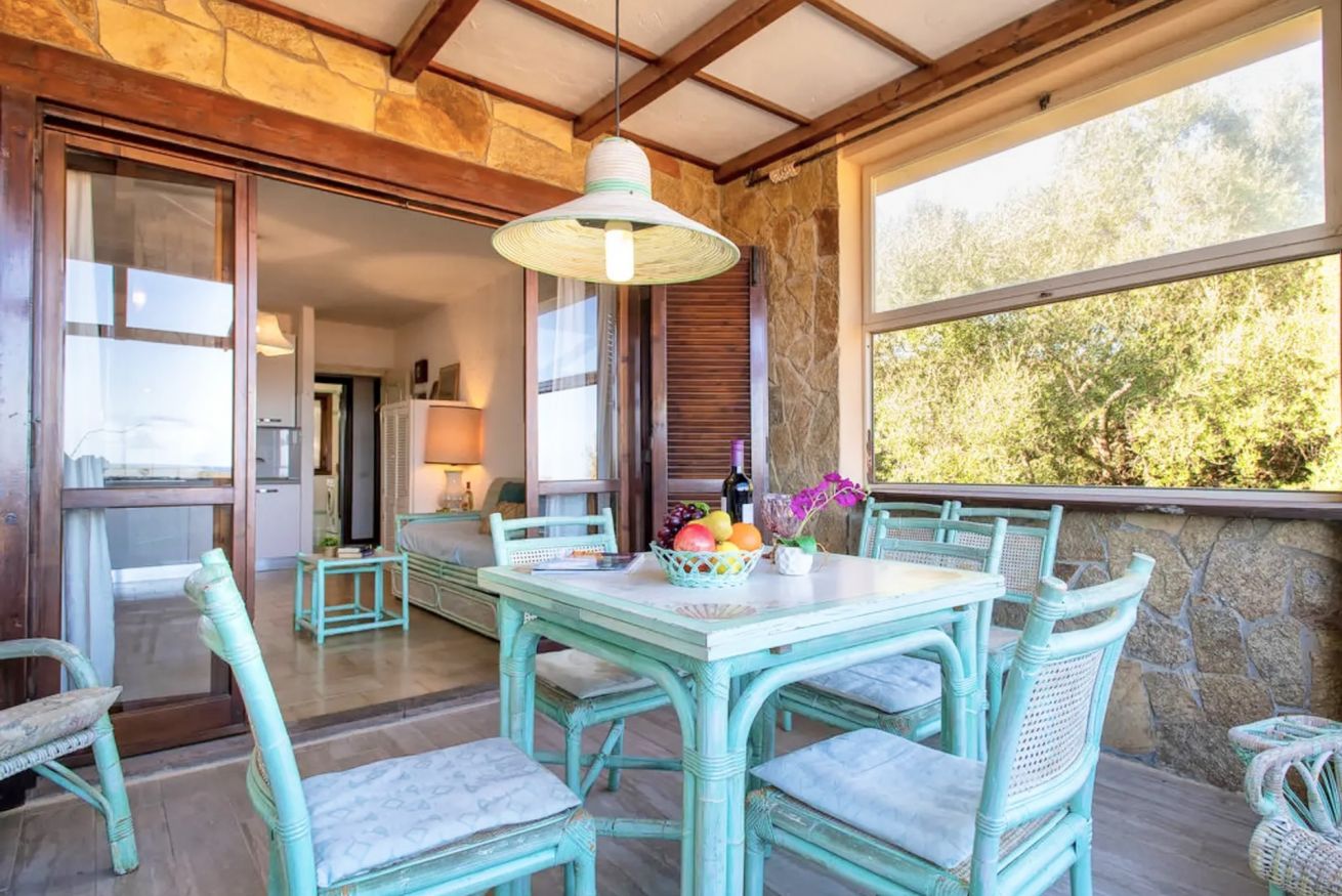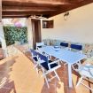 Ampia veranda con vista mare arredata con tavolo e sedie e piccola dependance nel giardino con letto a castello e ulteriore bagno con doccia.