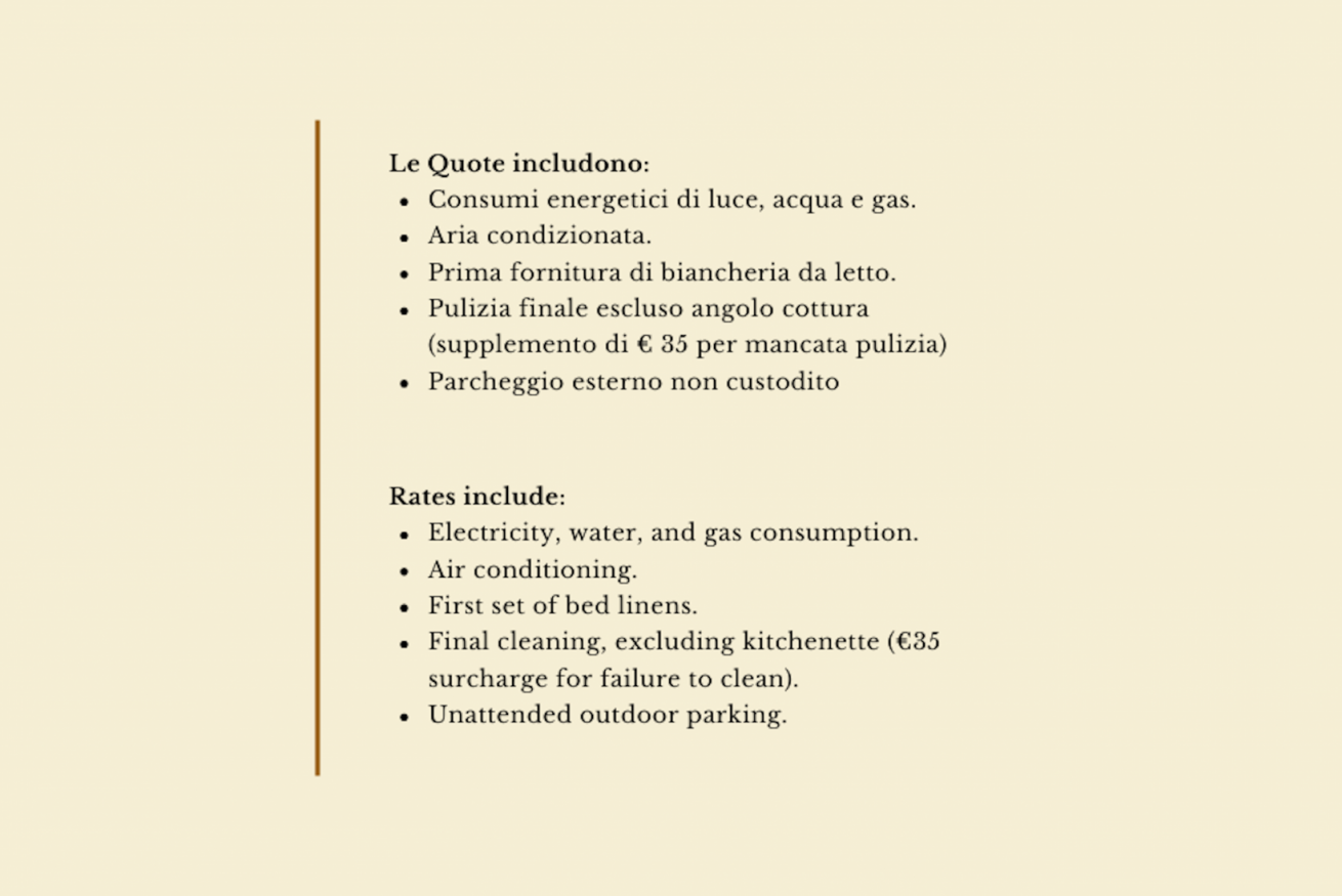 - arrivi notturni (LATE CHECK-IN) gli arrivi dopo le ore 20.00 devono essere preavvisati e richiesti per scritto con largo anticipo: il servizio è gratuito se segnalato per tempo per arrivi di sabato e domenica entro le 21.00; per arrivi oltre le 21.00 fino alle 24.00 è previsto un supplemento di €35; per arrivi infrasettimanali dopo le 20.00, il supplemento di €35 è obbligatorio.