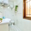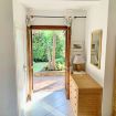 Due bagno con doccia, veranda coperta arredata con tavolo e sedie e giardino privato con doccia esterna.