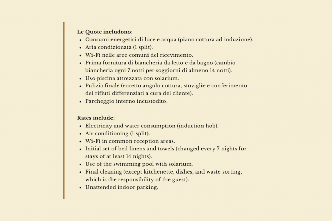 - Pulizia finale (eccetto angolo cottura e stoviglie e il rispetto della raccolta dei rifiuti differenziati sono una responsabilità del cliente altrimenti ci sarà una penale)