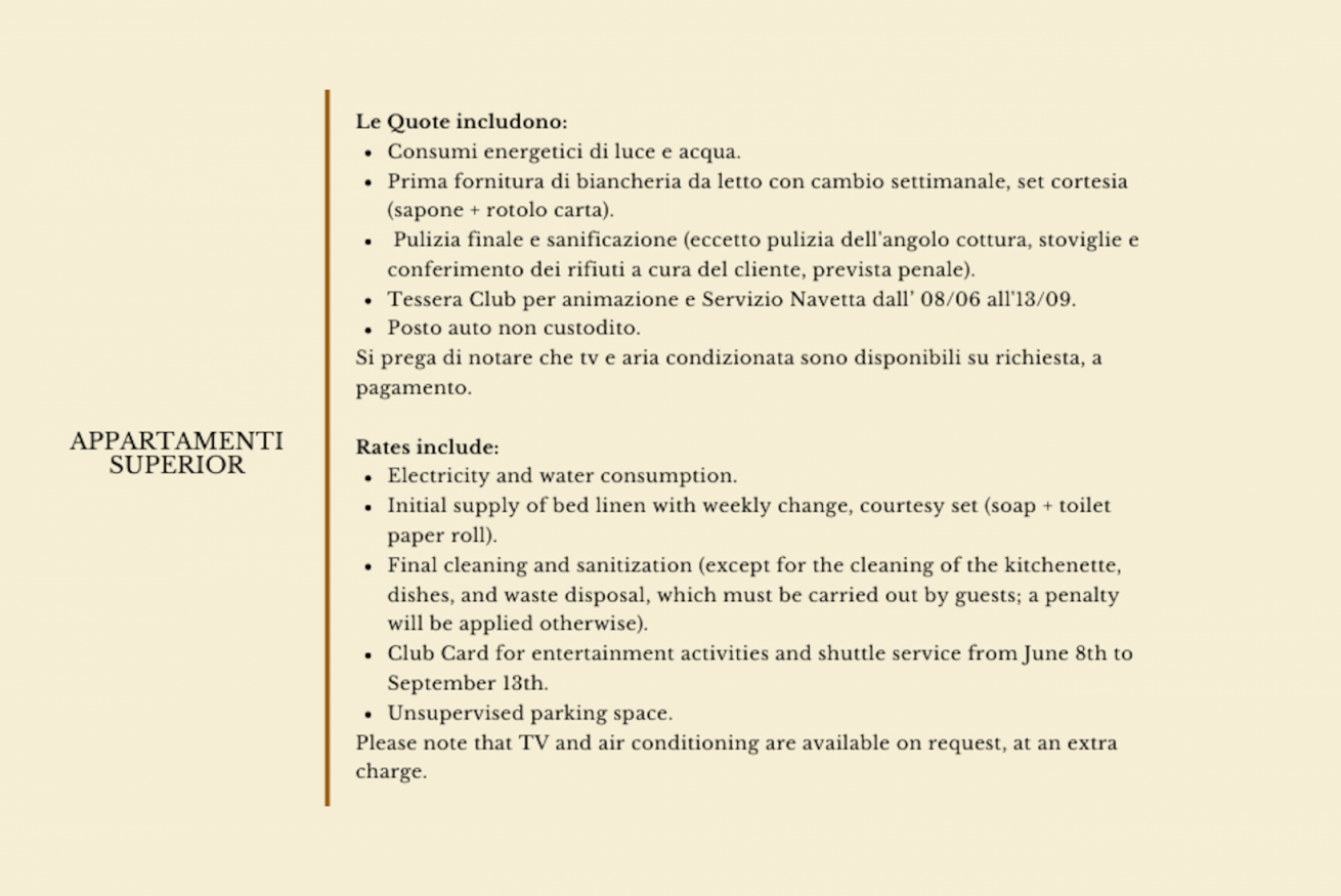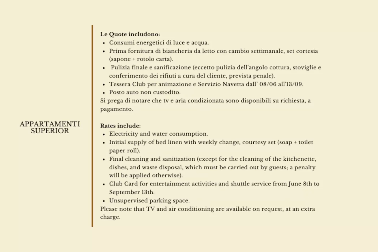 Prima di procedere all’acquisto di una vacanza, il Cliente prende visione dei posti disponibili nella Struttura Ricettiva e del prezzo stabilito per notte. Il prezzo è espresso in Euro ed è determinato sulla base della tariffa disponibile al momento della prenotazione, a seguito della quale, quest’ultimo verrà bloccato. In ogni caso IssTravel non sarà ritenuta responsabile di eventuali variazioni del prezzo applicate dalla Struttura Ricettiva o a seguito di ulteriori servizi richiesti al momento. Eventuali offerte speciali e promozioni sono esclusivamente limitate al periodo di tempo indicato nella pagina dedicata all’offerta di prenotazione.