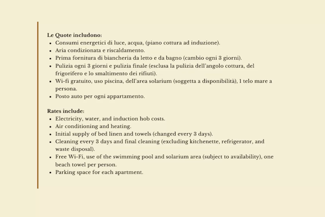 - consumi energetici di luce, acqua, aria condizionata e riscaldamento, prima fornitura di biancheria da letto e da bagno (cambio ogni 3 giorni), pulizia ogni 3 giorni e pulizia finale (esclusa la pulizia dell’angolo cottura, del frigorifero e lo smaltimento dei rifiuti); wi-fi gratuito, uso piscina, dell’area solarium (soggetta a disponibilità) e delle aree comuni, un telo mare a persona, un posto auto per ogni appartamento