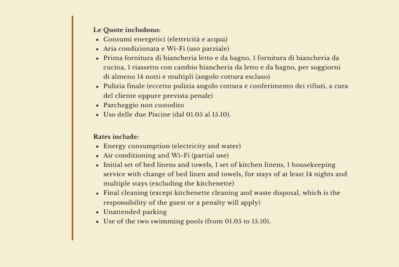 - consumi energetici di luce e acqua, aria condizionata, prima fornitura di biancheria letto e da bagno, 1 fornitura di biancheria da cucina (tovagliette all'americana), un riassetto con cambio biancheria da letto e da bagno, per soggiorni di almeno 14 notti e multipli (pulizia dell' angolo cottura escluso), pulizia finale (escluso angolo cottura e smaltimento rifiuti); wi-fii (ad uso parziale), uso lavanderia comune self service, uso delle piscine (secondo le date di aperture segnalate), parcheggio non custodito
