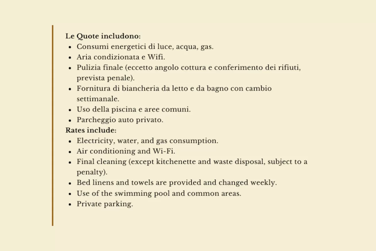 - prima fornitura di biancheria da letto e da bagno con cambio settimanale, aria condizionata, uso della piscina e del wi-fi, posto auto.