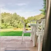 patio o balcone coperti oppure veranda coperta e giardino arredati con tavolo e sedie.