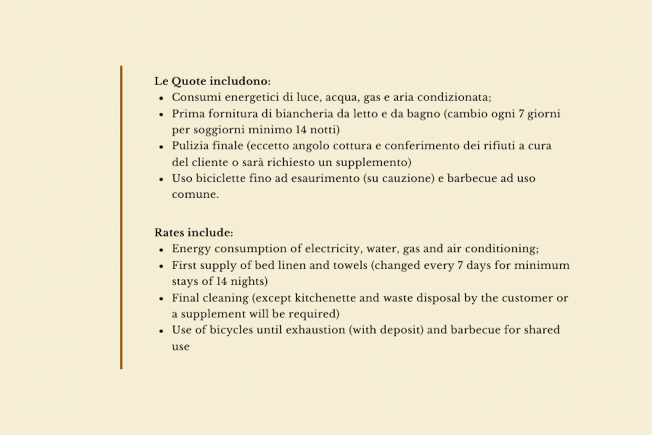 - Tourist tax: to be paid on site in cash, it is mandatory according to municipal provisions. The amount may vary depending on the period.