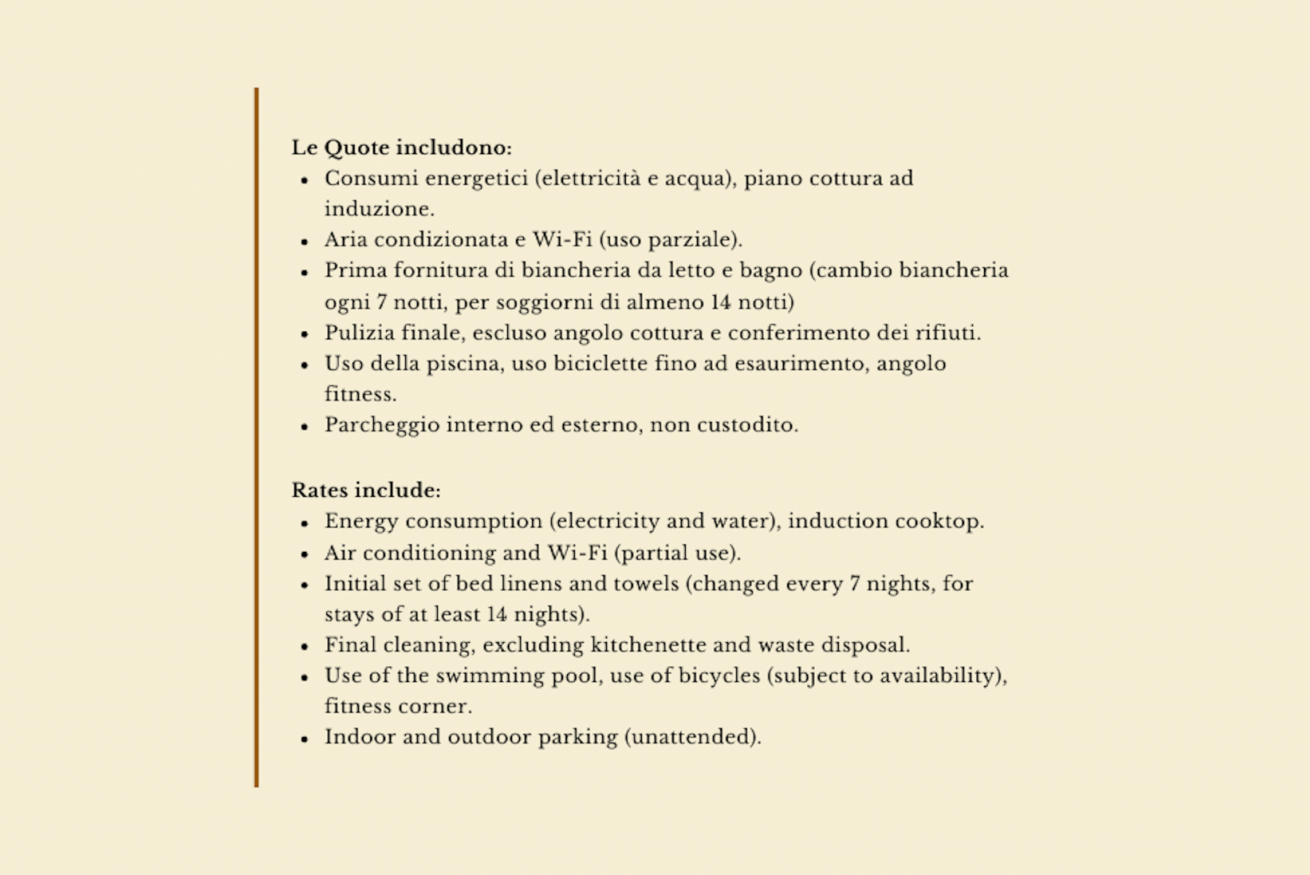 - biancheria: biancheria letto extra € 20 set matrimoniale; € 10 set singolo; biancheria bagno extra € 10 a persona a set (telo doccia, telo viso e telo ospite)