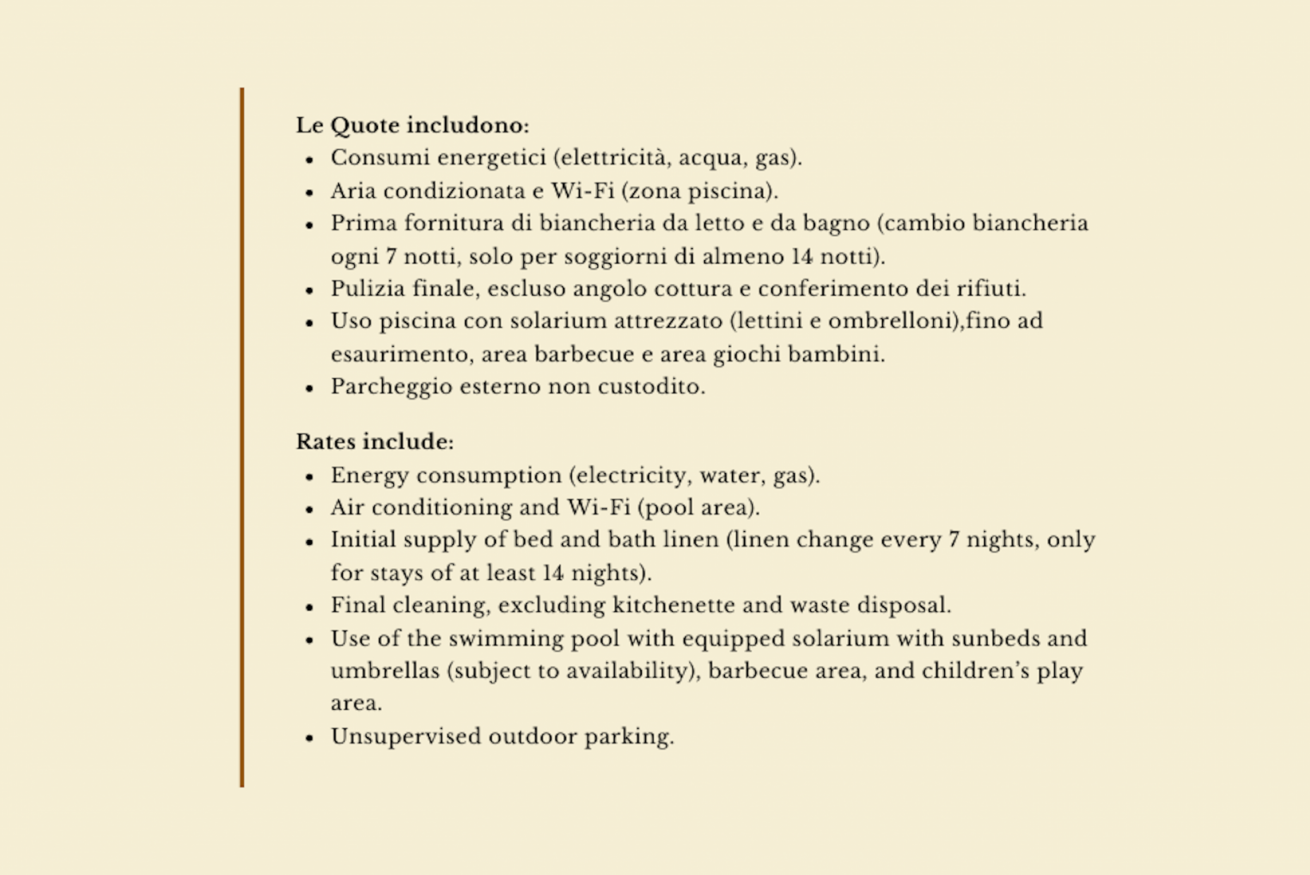 - prima fornitura di biancheria da letto e da bagno (cambio ogni 7 giorni per soggiorni minimo 14 notti)