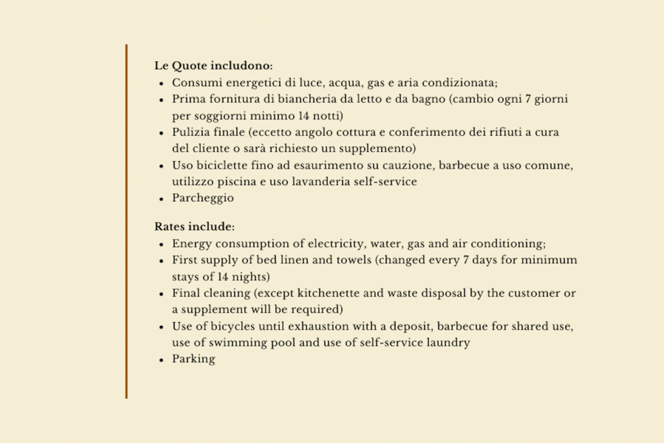 * prima fornitura biancheria da letto e da bagno (cambio ogni 7 giorni per soggiorni minimo 14 notti)