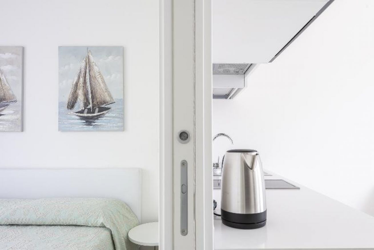 L’appartamento dispone di un soggiorno luminoso con angolo cottura, completo di piastra a induzione a 2 fuochi, frigorifero, microonde, tostapane, bollitore e macchina da caffè a capsule (capsule disponibili in reception), perfetto per iniziare la giornata con una colazione rilassante.