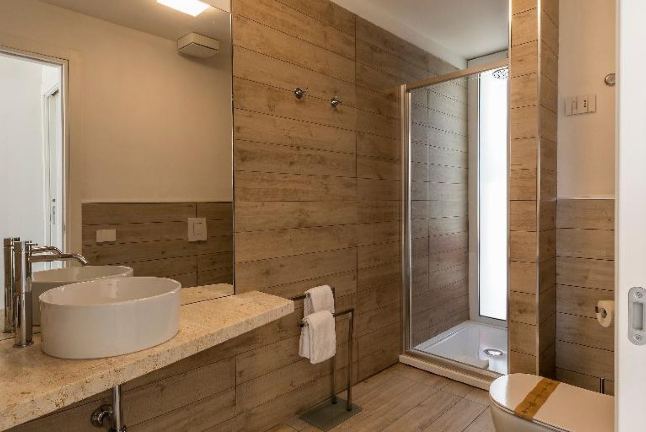 Il bagno moderno, dotato di doccia e asciugacapelli , unisce praticità e stile.