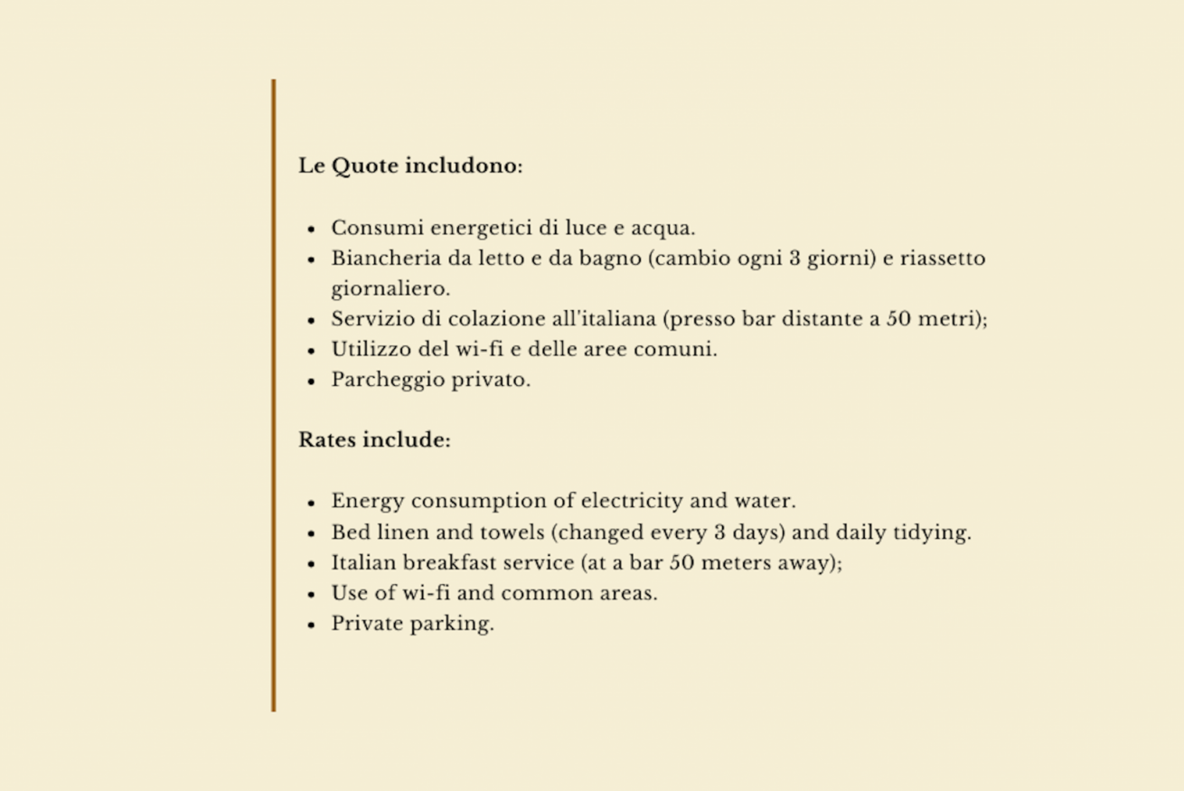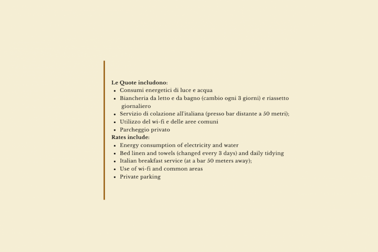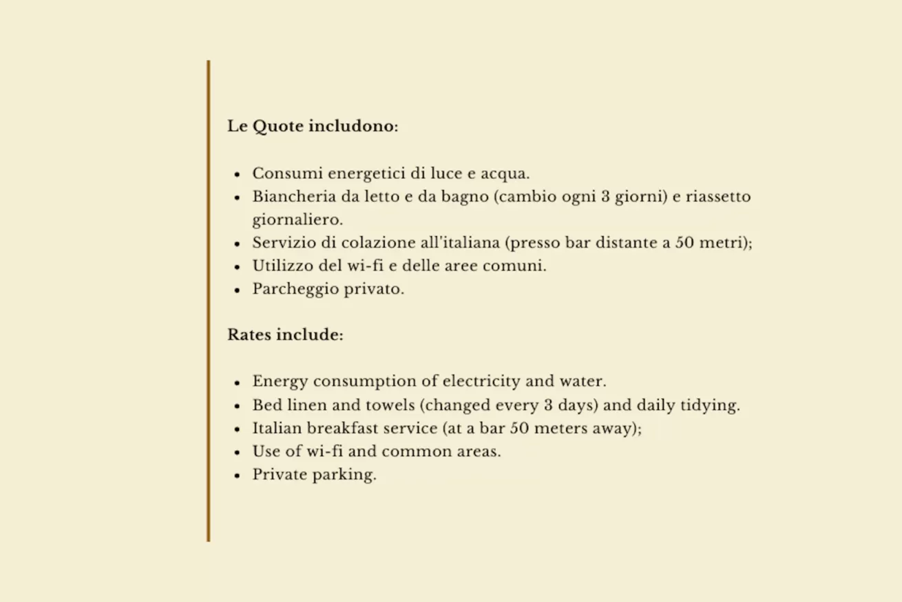Formula Hotel: consumi di luce e acqua, biancheria da letto e da bagno (cambio biancheria ogni 3 giorni), riassetto giornaliero e servizio colazione all’italiana (presso il bar a 50 mt); uso del wi-fi e delle aree comuni, parcheggio privato.