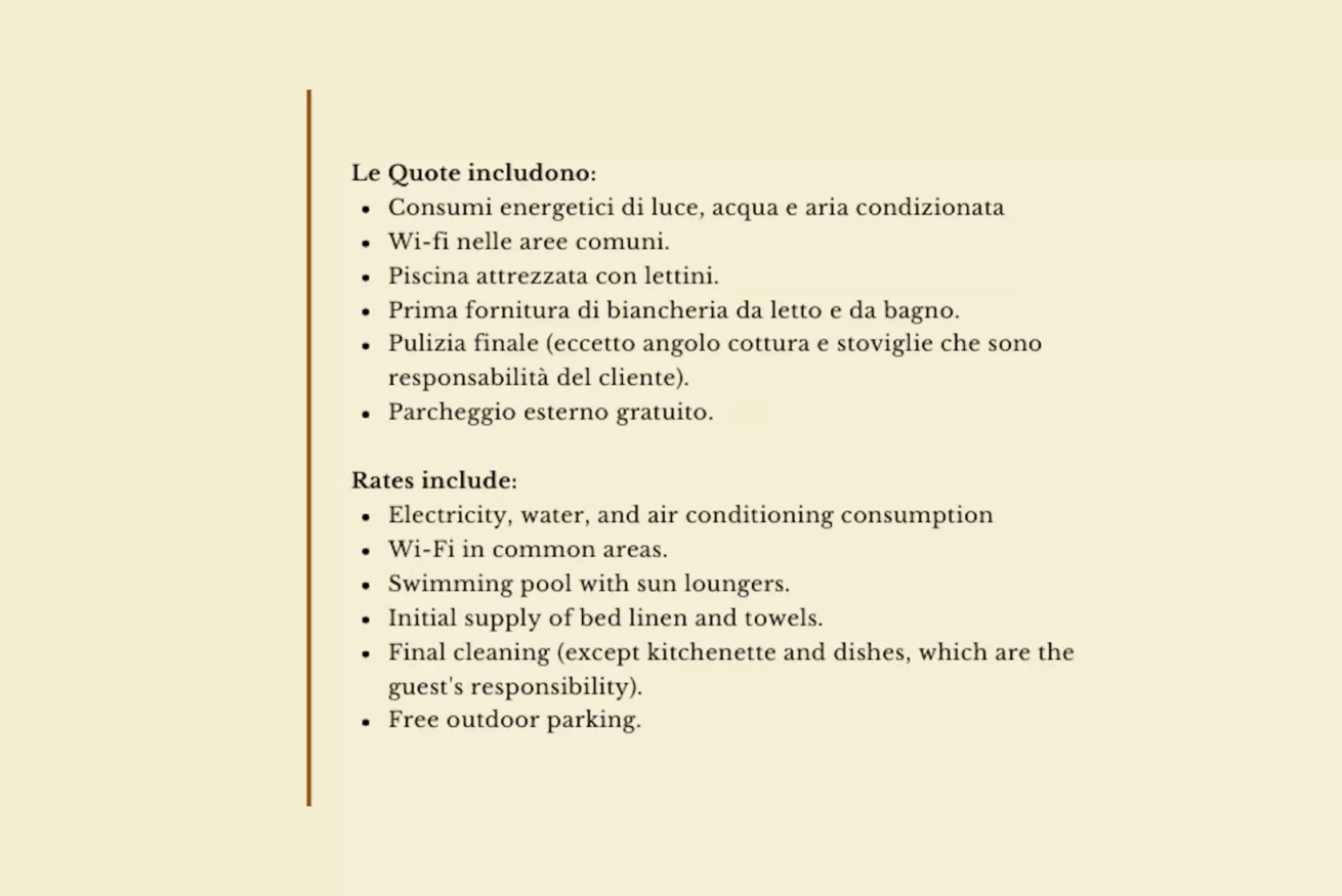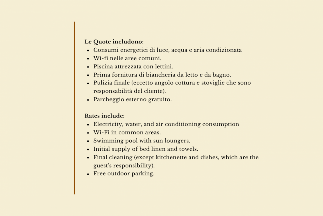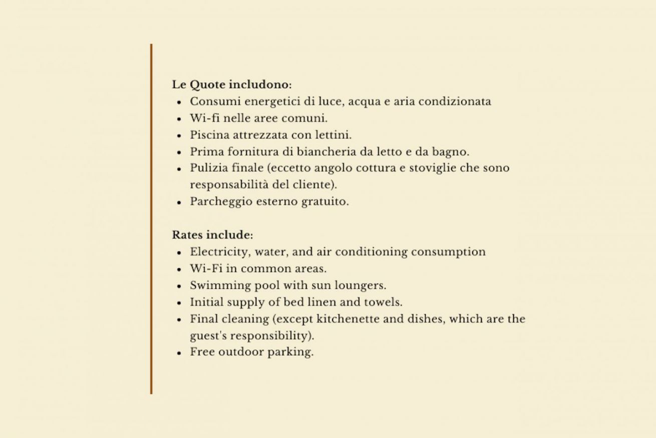 - consumi luce, acqua, prima fornitura di biancheria da letto e da bagno, pulizia finale, uso della piscina, aria condizionata, wi-fi nelle aree comuni, un posto auto.