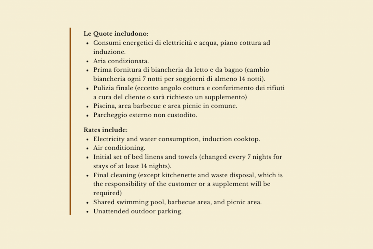 - cleaning of the kitchenette and disposal of waste are the responsibility of the customer, in case of failure to comply with the rules a penalty of € 50 will be applied for failure to clean the kitchenette and an additional € 50 for failure to dispose of waste