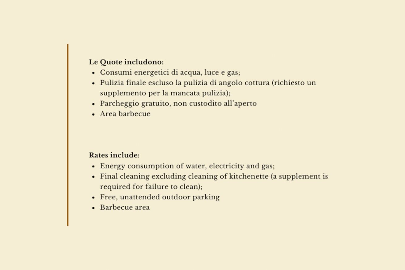 - pets allowed (small size) to be reported at the time of booking, extra € 50 per stay for cleaning