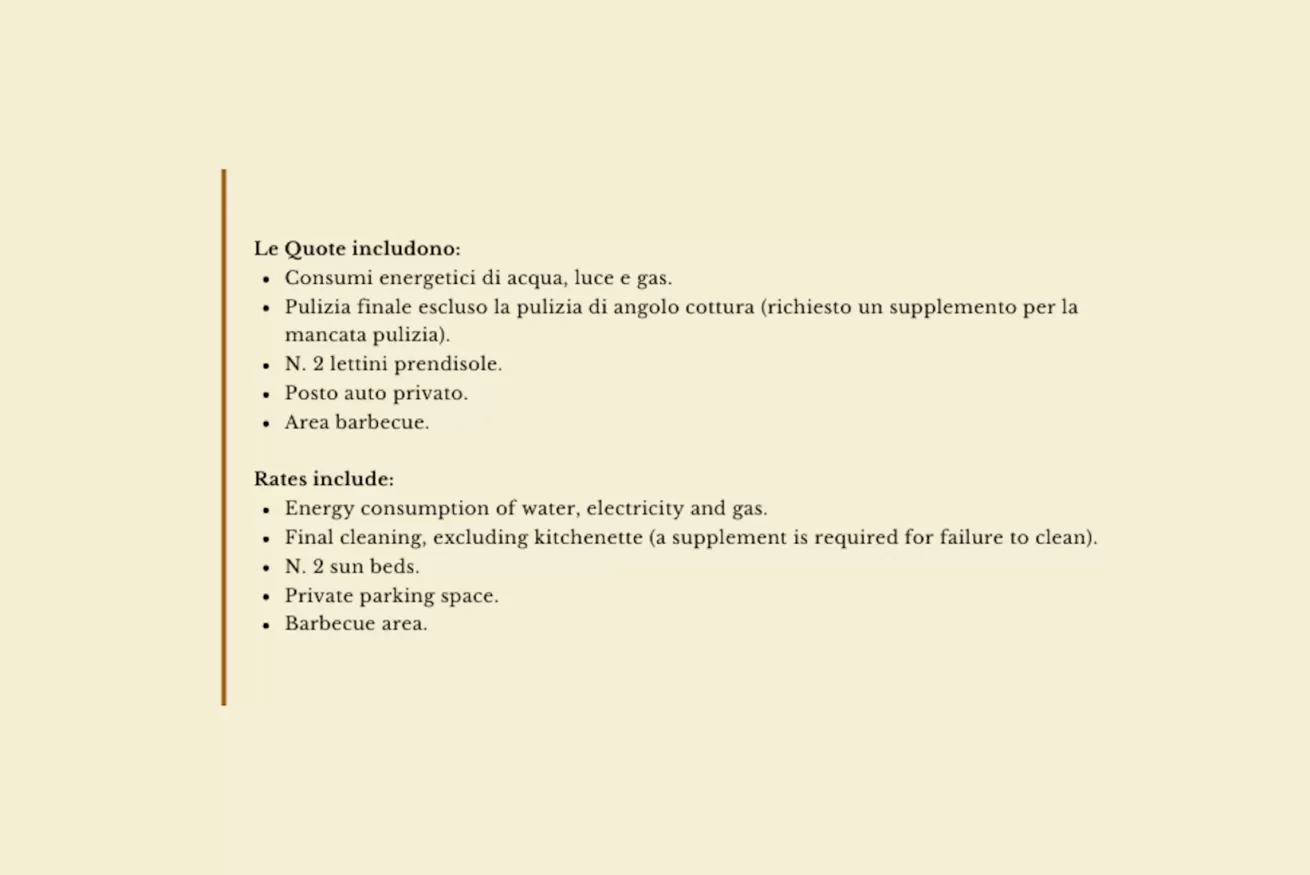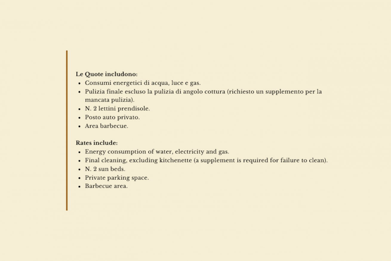 - consumi acqua luce e gas, pulizia finale escluso angolo cottura (supplemento di € 40 per mancata pulizia), 2 lettini prendi sole, barbecue e 1 posto auto