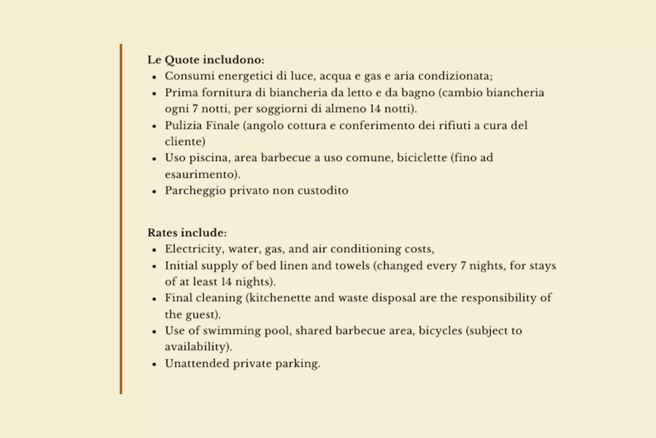- biancheria: biancheria letto extra € 20 set matrimoniale; € 10 set singolo; biancheria bagno extra € 10 a persona a set (telo doccia, telo viso e telo ospite)