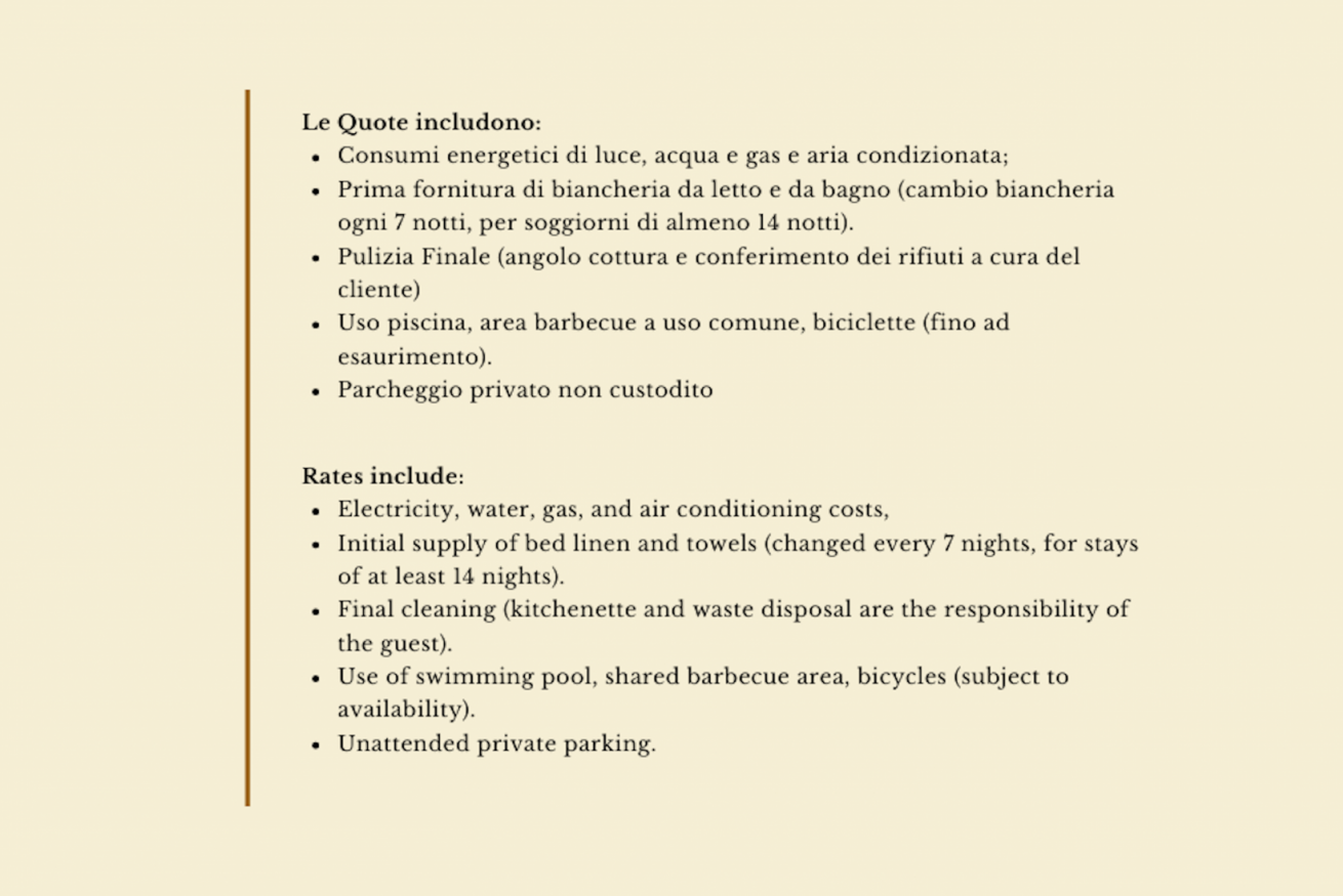 - animals TO BE REPORTED at the time of booking (max 25 kg and one for each apartment): on request, €50 per stay, excluding common areas