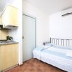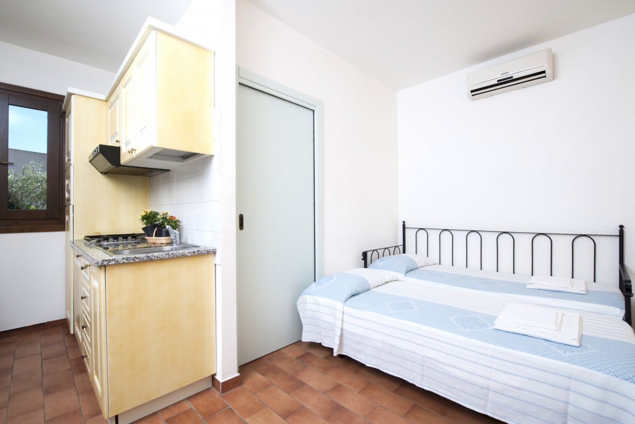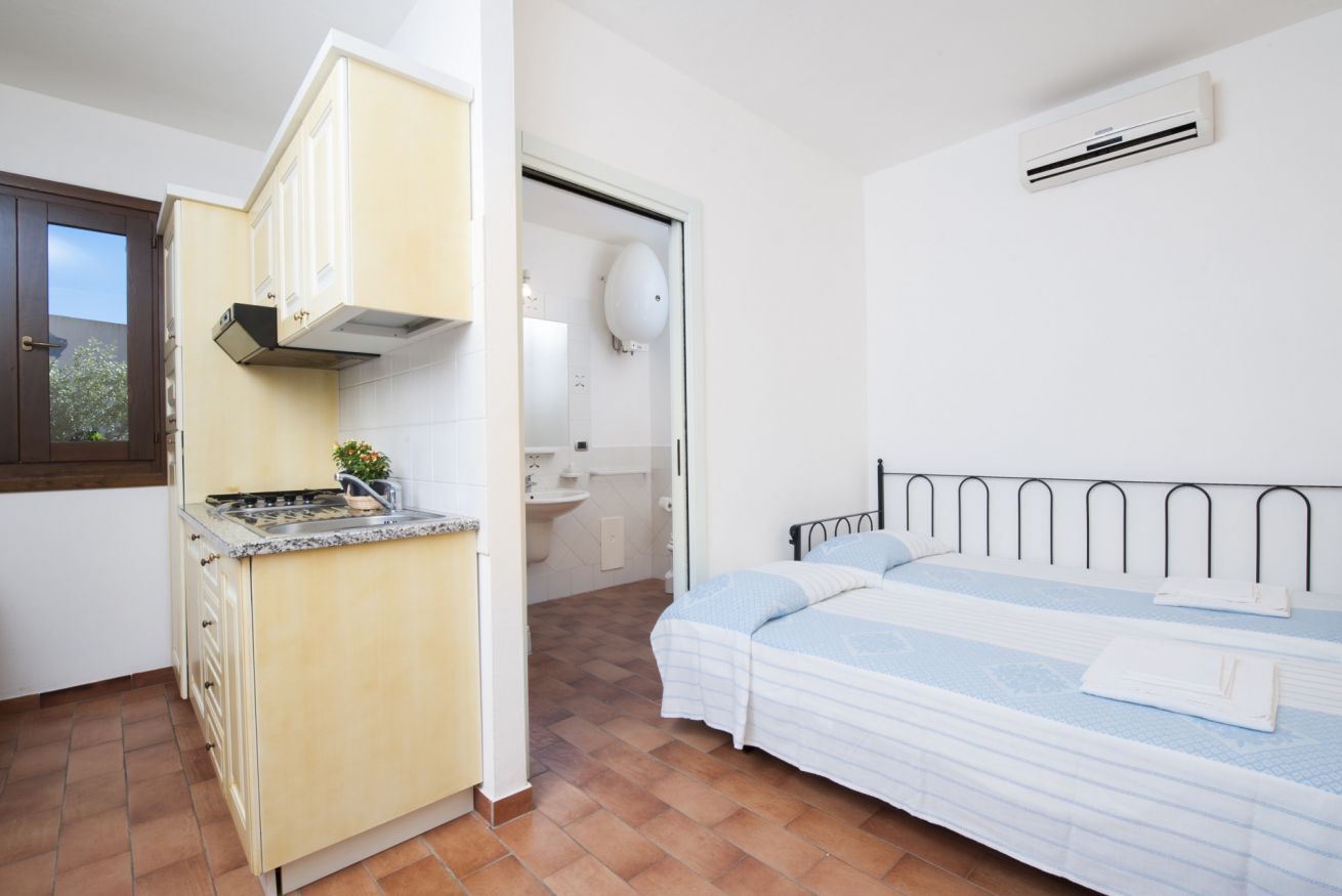 Appartamento monolocale al piano terreno di circa 22 mq composto da un unico ambiente, con letto matrimoniale, angolo cottura attrezzato e bagno con doccia.